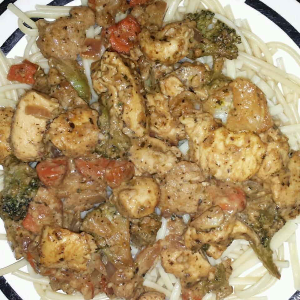 For extra flavor, try adding freshly minced cloves of garlic, a squeeze of lemon juice or zest, a little chicken broth, or a tablespoon of salty capers. Then, season chicken with lemon pepper seasoning and cook in an oiled skillet until it’s almost fully cooked. Turn the heat down and carefully add the sauce to the skillet. Allow the lemon sauce sauce to bubble at a low boil for about 5 minutes, or until it’s thickened and reduced some. Angel hair pasta cooks quickly, in just about the amount of time you need to let the chicken and vegetables simmer once you add the chicken back into the pan. So you'll never end up in that awkward bit of kitchen downtime waiting for pasta to finish cooking while hoping the stuff in your skillet doesn't overcook.